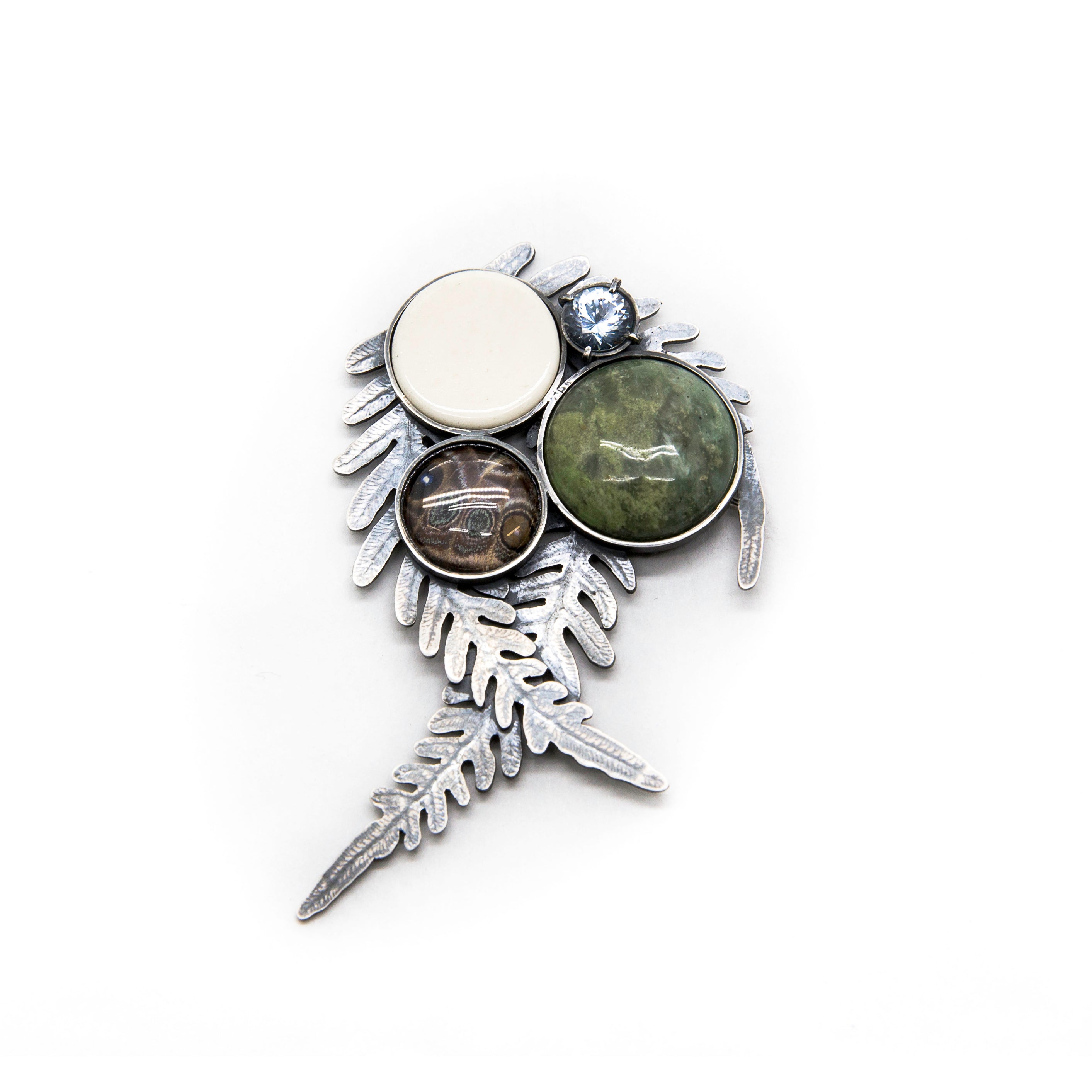 These objects are all carefully set in sterling silver and are encompassed by sterling silver ferns, which were crafted by embossing real ferns into the metal.