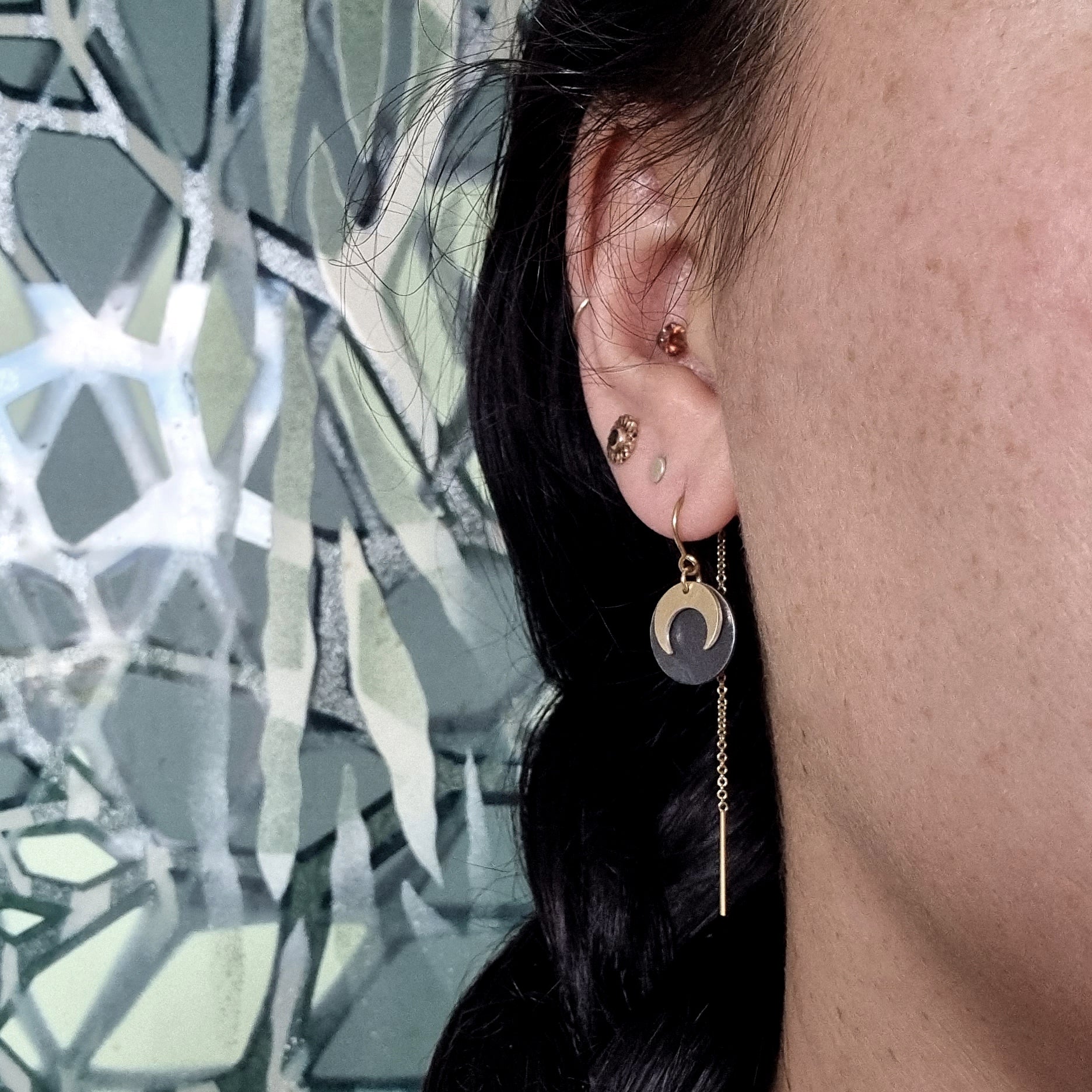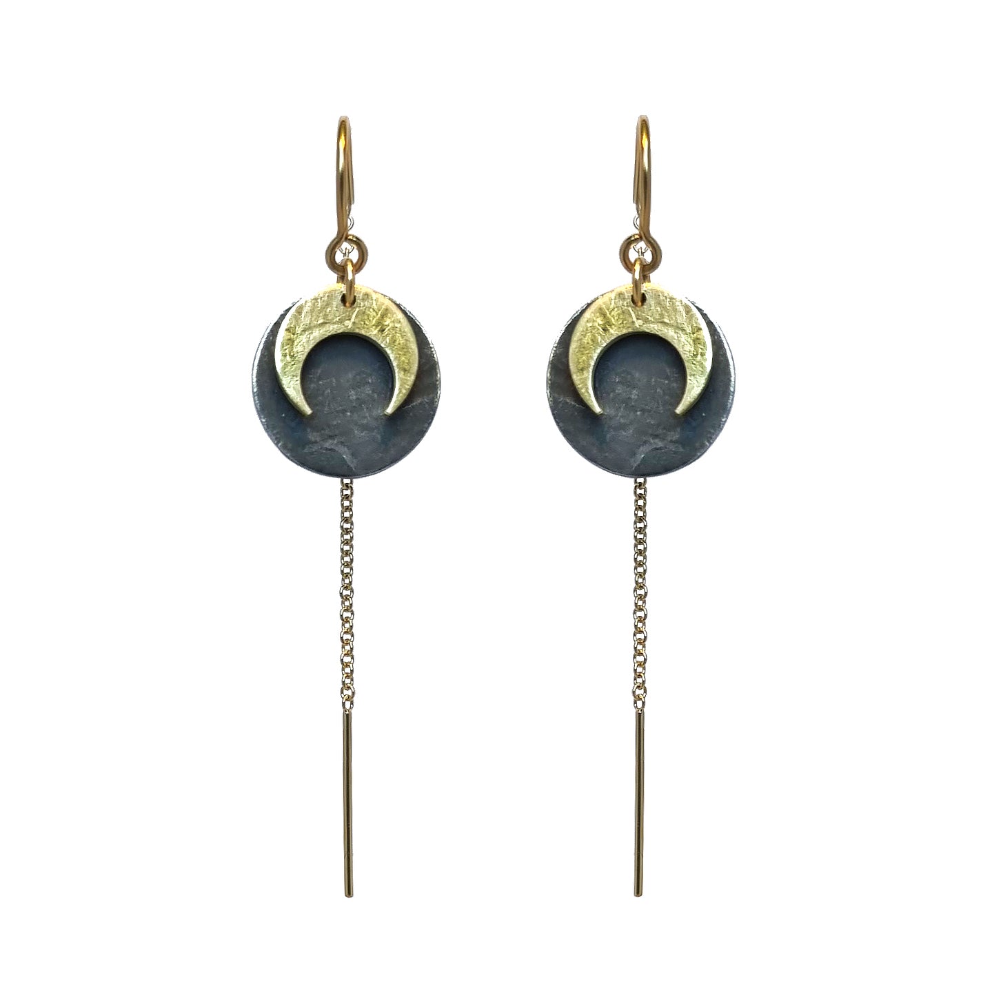 The Luna Eclipse Thread Earrings are available in two styles, gold on black or gold on silver.