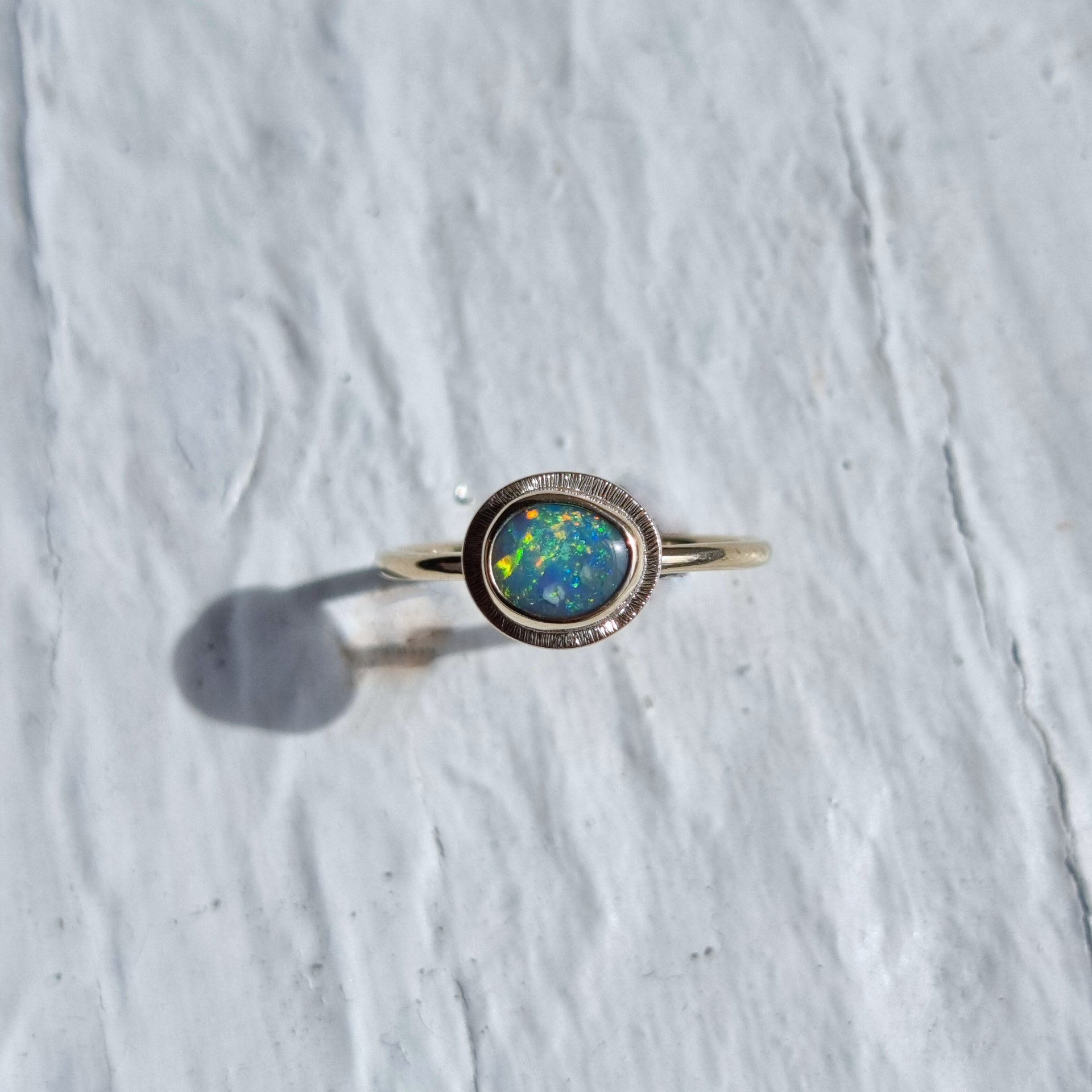 Set in a textured halo of 9ct Yellow Gold this solid Australian Lightning Ridge Dark Opal has vibrant flashes of blues, greens, yellows, and oranges.
