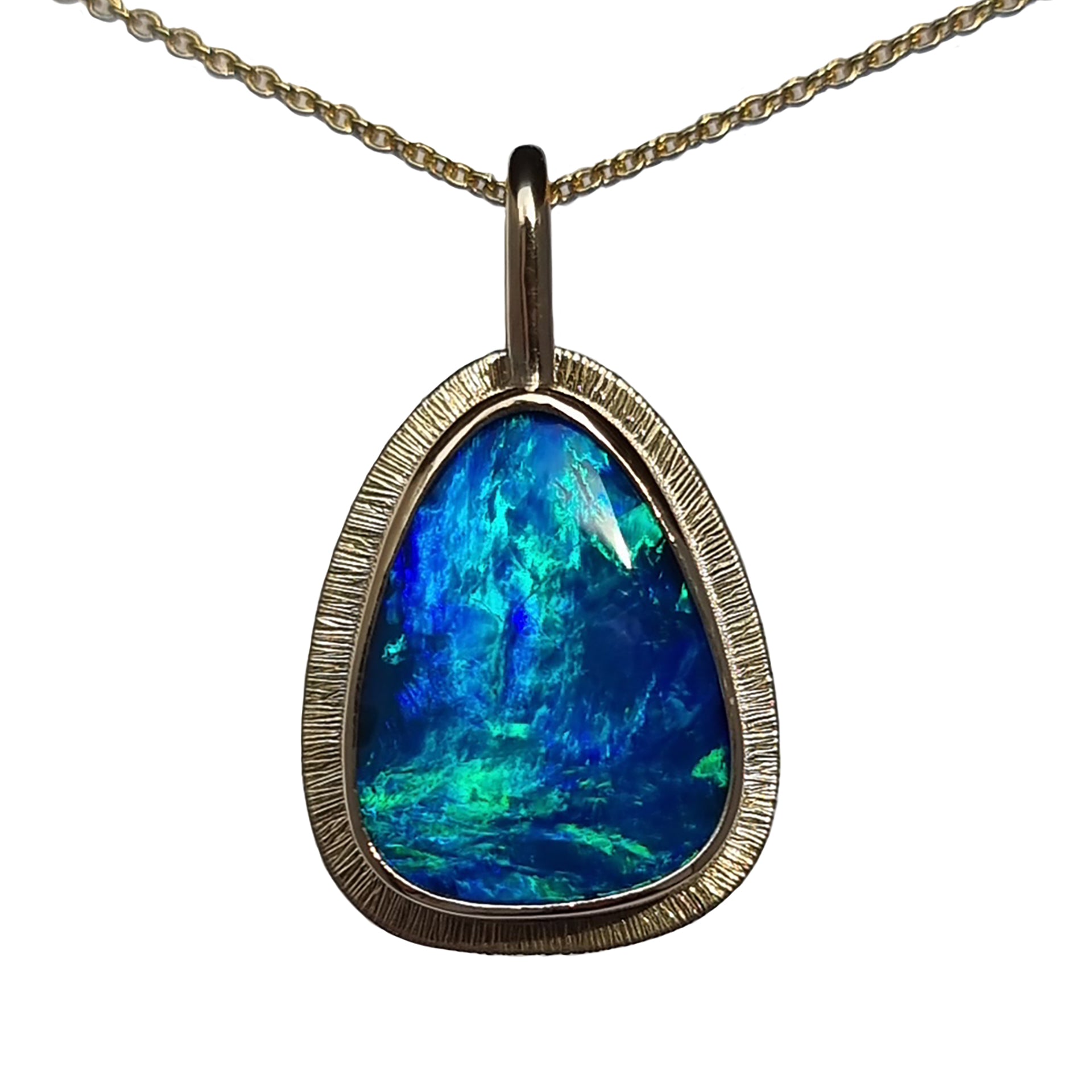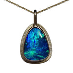 Set in a textured 9ct Yellow Gold Halo, this Australian Opal Doublet has electric flashes of blues and aqua greens.